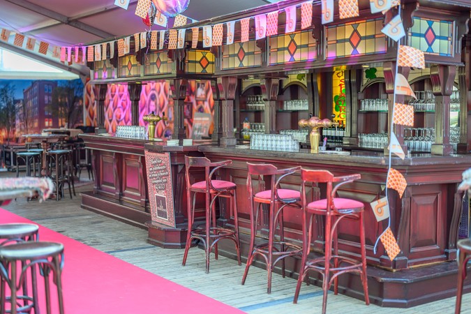 Bij aankomst werden de gasten warm onthaald met een glas limocello en een huisgemaakte wafel, dit terwijl er een muzikaal welkom was van een draaiorgel. De sfeer was meteen gezet, helemaal dankzij de sfeervolle aankleding: een authentieke houten bar, kleurrijke slingers en een tent die aanvoelde als een bruine kroeg in de Jordaan. Echte ouderwetse gezelligheid met een Amsterdamse Touch.